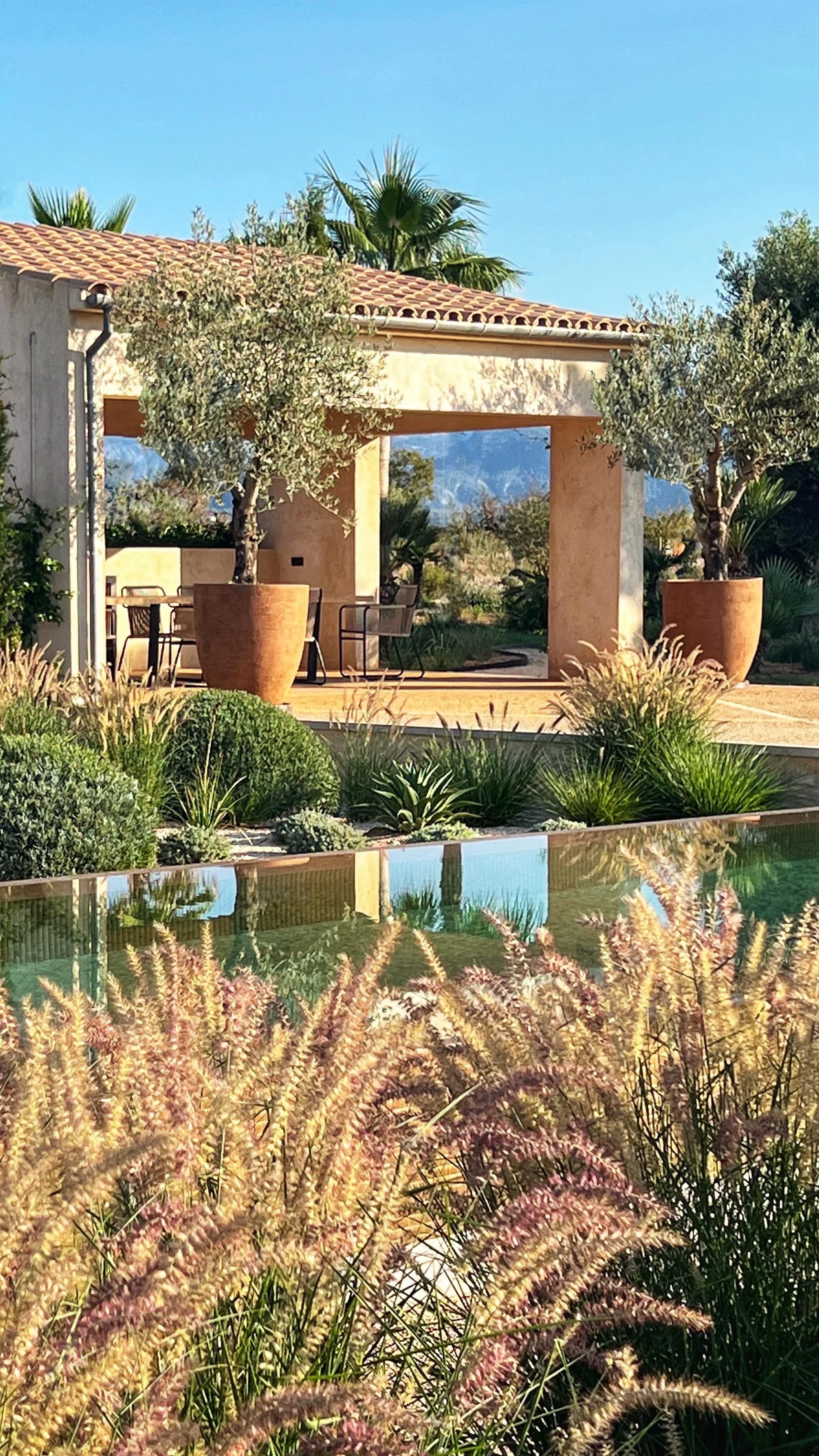 An organic vineyard nestled at the base of the Tramuntana mountains. A series of garden rooms and pool pays tribute to some of the formal aspects of the estate while blending the surrounding landscape to create a personal sanctuary.